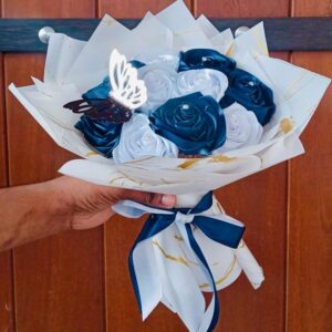 This dazzling Glitter Flower Bouquet features a striking combination of royal blue and rainbow-white ribbon flowers, adorned with a subtle shimmer for a luxurious and sparkling effect. Handcrafted with precision, the bouquet includes 10 beautifully arranged glittered flowers, accented with one elegant decorative butterfly, adding charm and sophistication.