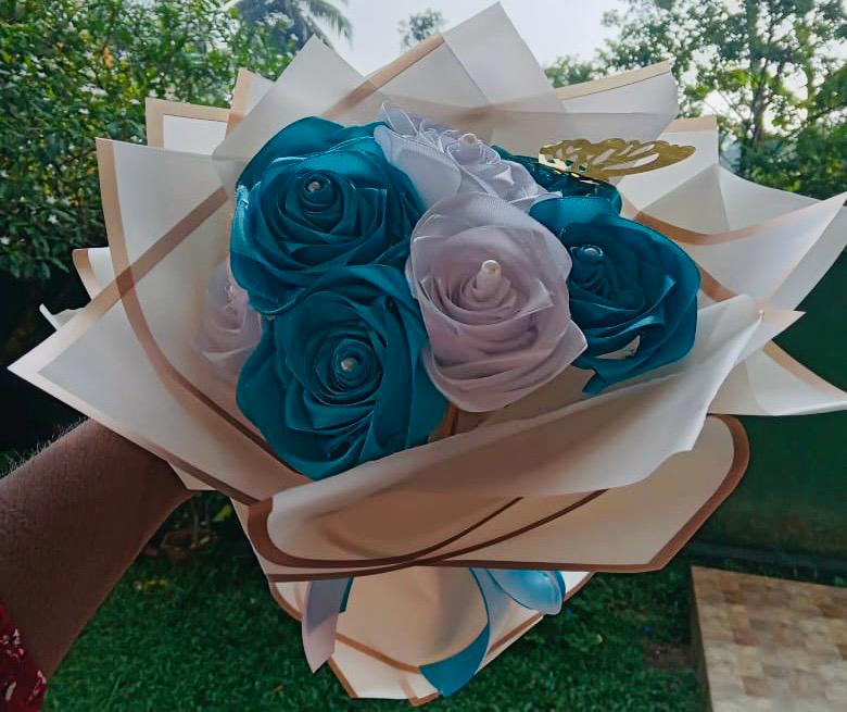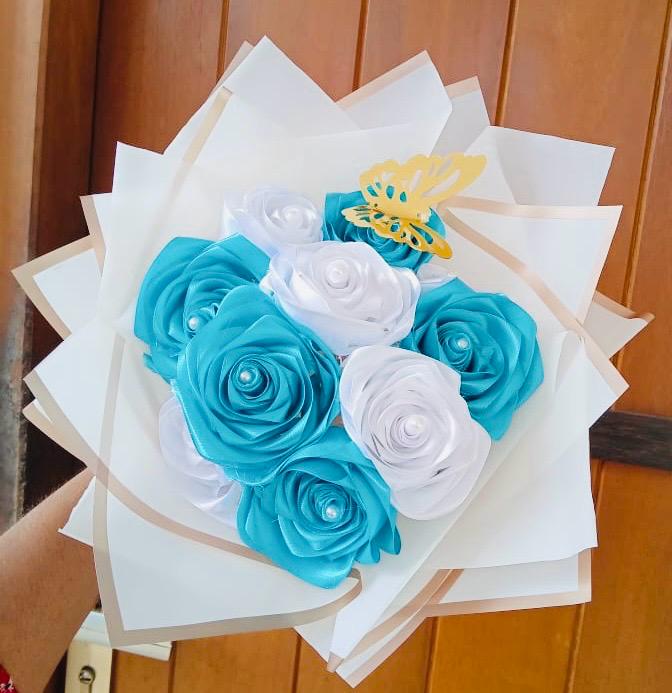 This refreshing Ribbon Flower Bouquet features a serene blend of aqua and white ribbon flowers, symbolizing tranquility, purity, and elegance. Expertly handcrafted, the bouquet includes 10 beautifully arranged ribbon flowers, accented with one delicate decorative butterfly for a charming and luxurious touch.