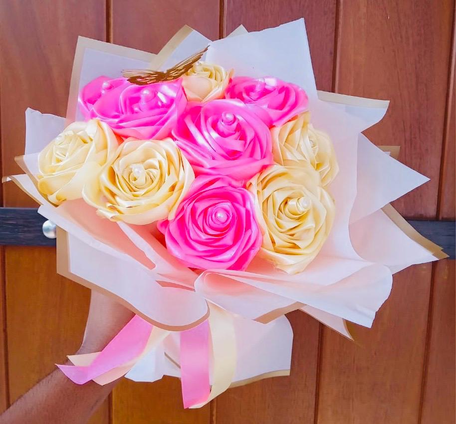This elegant Ribbon Flower Bouquet features a soft and charming combination of pink and beige ribbon flowers, symbolizing love, warmth, and grace. Handcrafted with care, the bouquet includes 10 beautifully arranged ribbon flowers, enhanced with one delicate decorative butterfly for a luxurious and eye-catching finish.