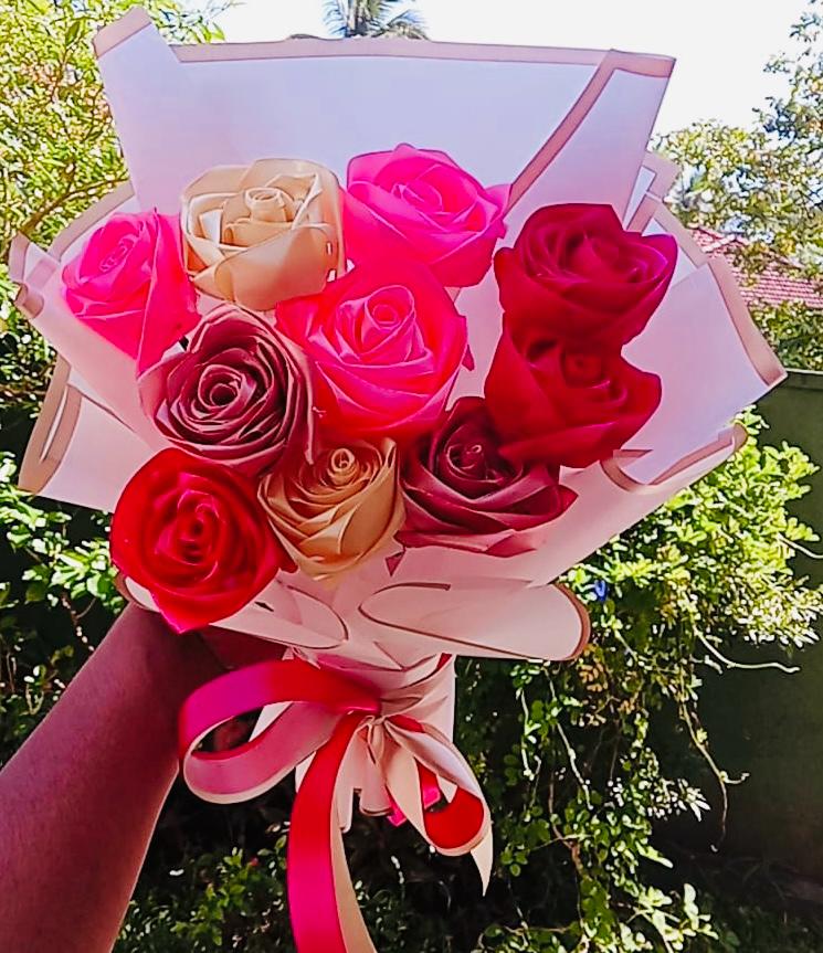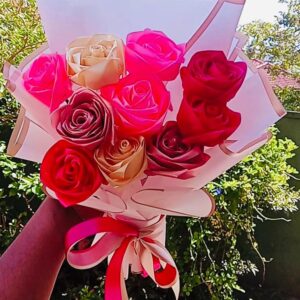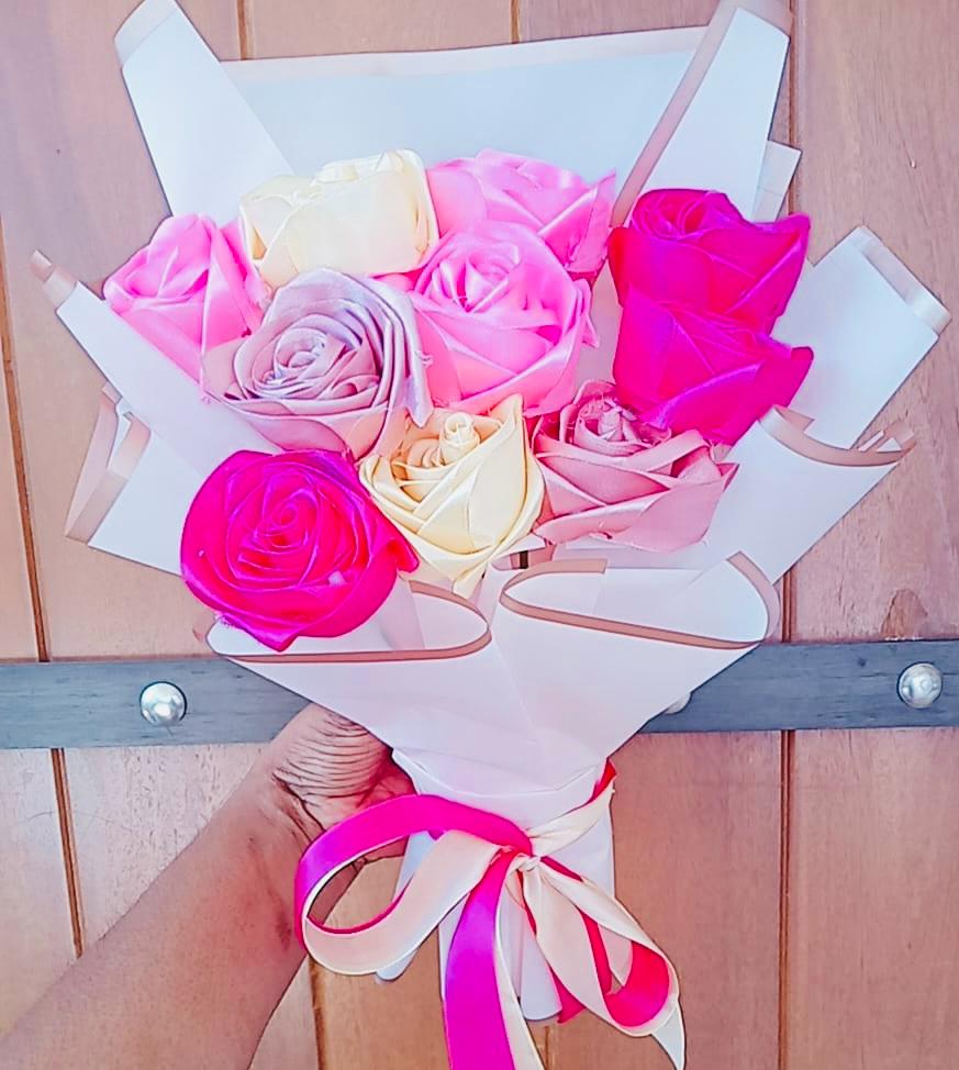This elegant Ribbon Flower Bouquet features a refined blend of pink, beige, rose, and bronze ribbon flowers, creating a warm and luxurious colour harmony. Carefully handcrafted, the bouquet includes 10 beautifully detailed ribbon flowers, designed to reflect grace, romance, and timeless elegance.