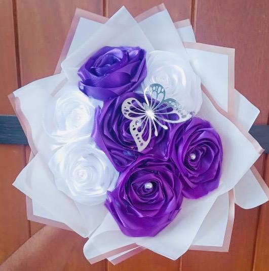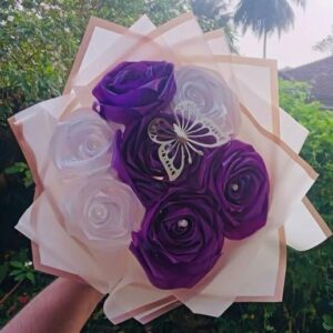 This charming Ribbon Flower Bouquet features a delicate combination of purple and white ribbon flowers, symbolizing elegance, purity, and admiration. Handcrafted with care, the bouquet includes 7 beautifully arranged ribbon flowers, accented with one graceful decorative butterfly for a luxurious and eye-catching touch.