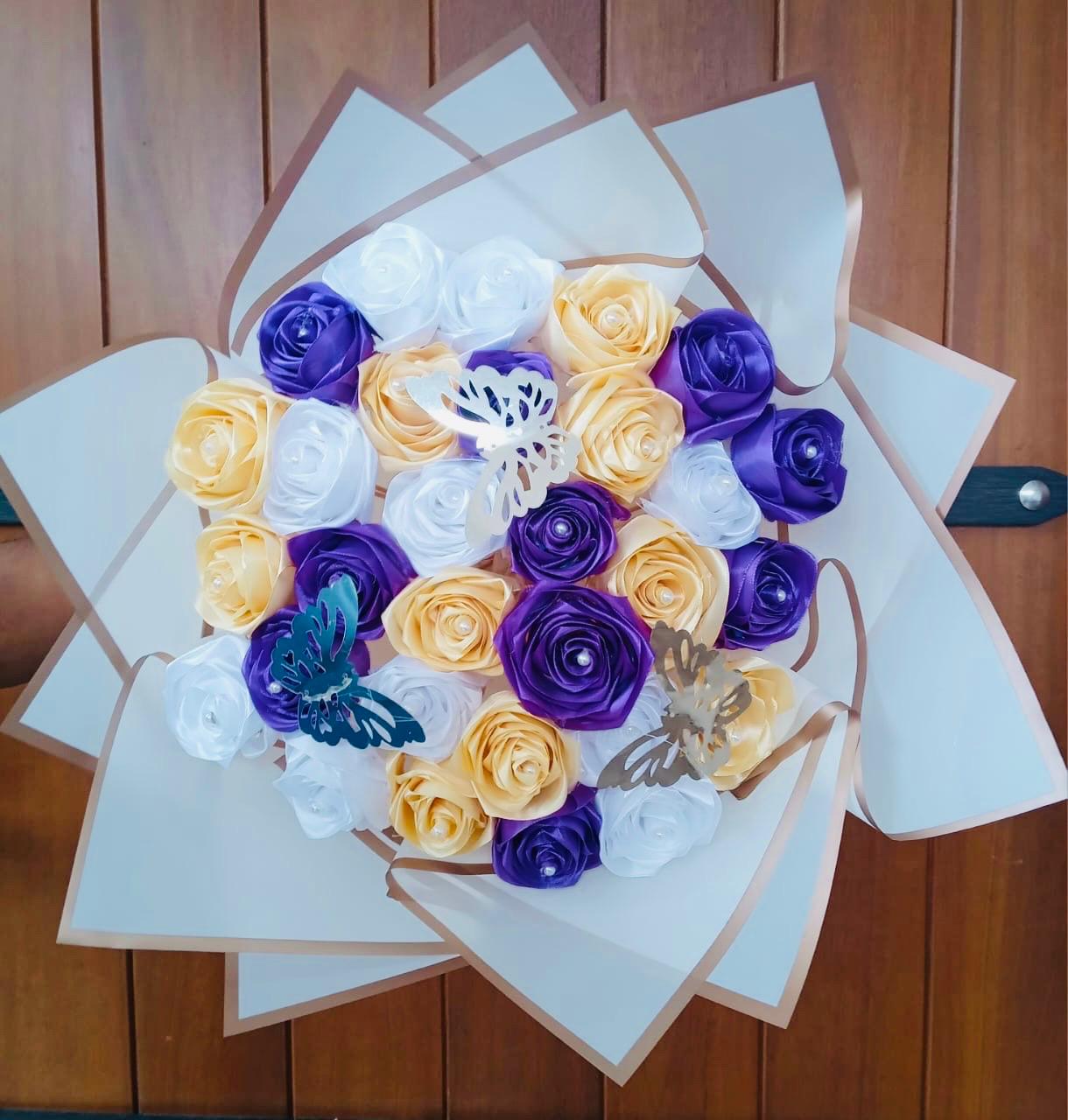 This stunning Ribbon Flower Bouquet features a vibrant and harmonious blend of purple, yellow, and white ribbon flowers, symbolizing elegance, joy, positivity, and purity. Expertly handcrafted, the bouquet includes 30 beautifully crafted ribbon flowers, thoughtfully arranged and enhanced with 3 delicate decorative butterflies for a luxurious and eye-catching finish.