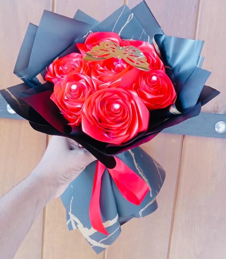 This stunning Ribbon Flower Bouquet features 7 beautifully handcrafted red ribbon flowers, symbolizing love, passion, and admiration. Carefully arranged and accented with one delicate decorative butterfly, it adds a touch of elegance and charm to the presentation.