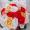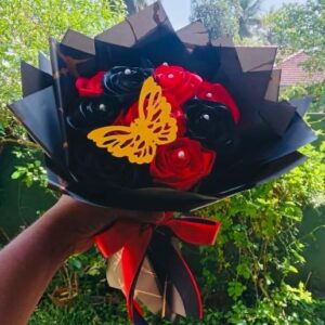 This striking Ribbon Flower Bouquet features a bold and dramatic combination of red and black ribbon flowers, symbolizing passion, elegance, and sophistication. Handcrafted with precision, the bouquet includes 10 beautifully arranged ribbon flowers, accented with one delicate decorative butterfly for a luxurious and eye-catching touch.