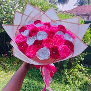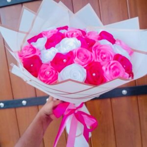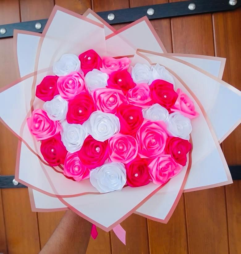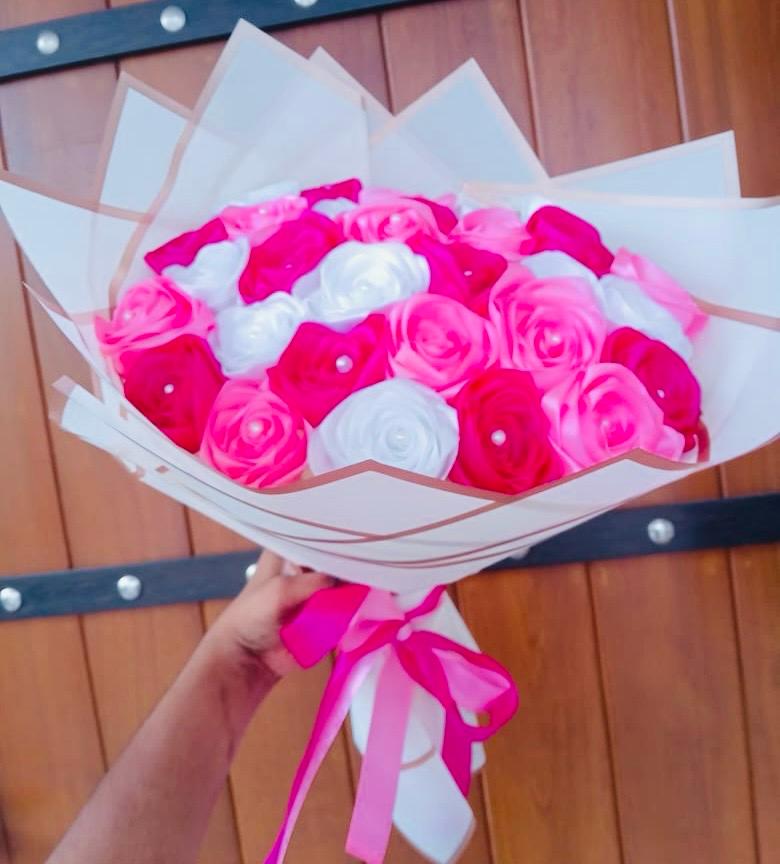 This grand Ribbon Flower Bouquet features a vibrant and harmonious blend of red, white, and pink ribbon flowers, symbolizing love, purity, and affection. Expertly handcrafted, the bouquet includes 30 beautifully arranged ribbon flowers, creating a luxurious and eye-catching presentation.