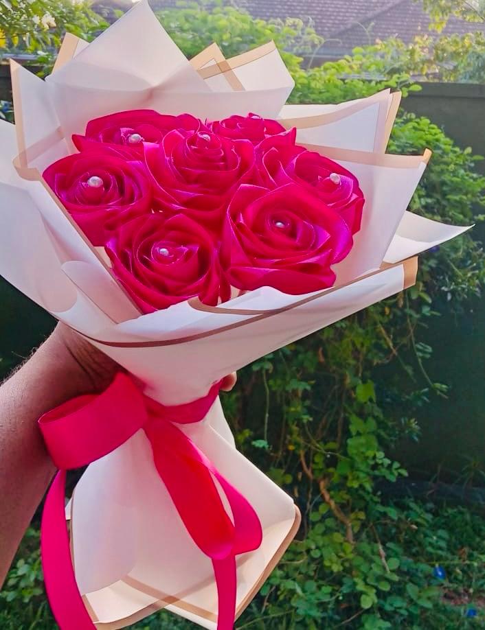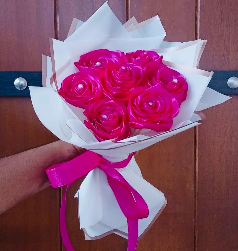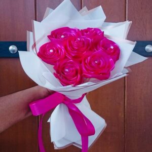 This striking Ribbon Flower Bouquet features 7 beautifully handcrafted ruby red ribbon flowers, symbolizing love, passion, and deep admiration. Elegantly arranged, the bouquet showcases a bold and timeless charm, perfect for expressing heartfelt emotions.