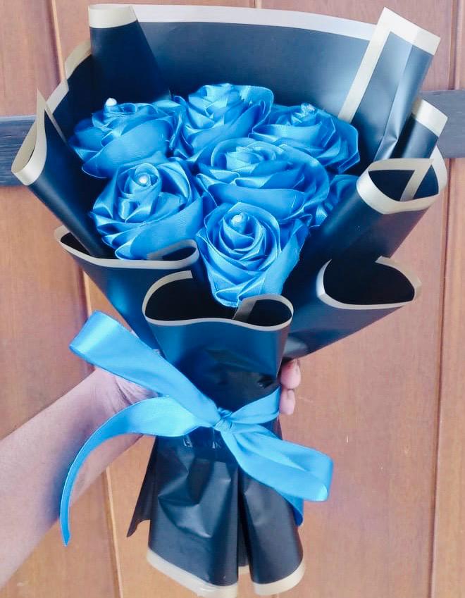 This elegant Ribbon Flower Bouquet features 7 exquisitely handcrafted sapphire blue ribbon flowers, symbolizing loyalty, trust, and timeless beauty. Gracefully arranged, the bouquet offers a refined and sophisticated look, perfect for meaningful gifting.